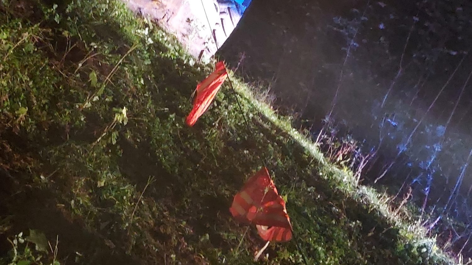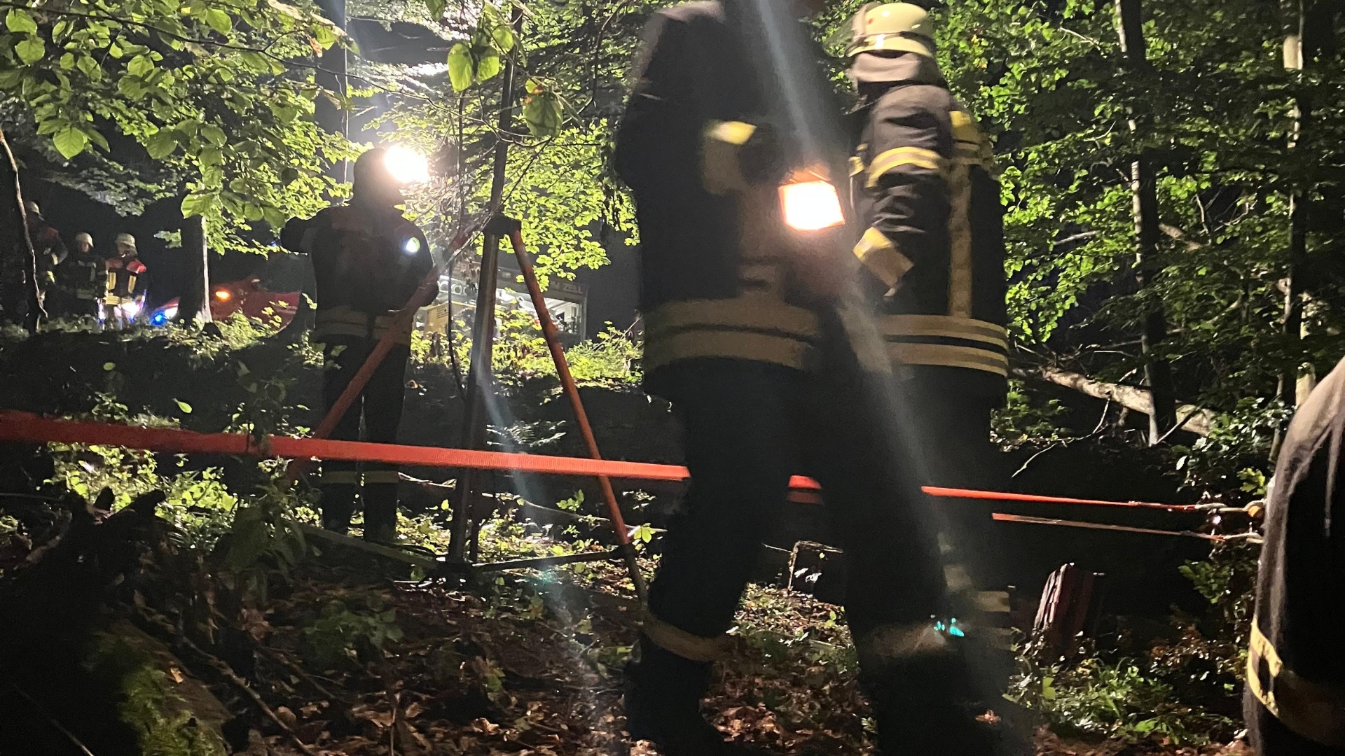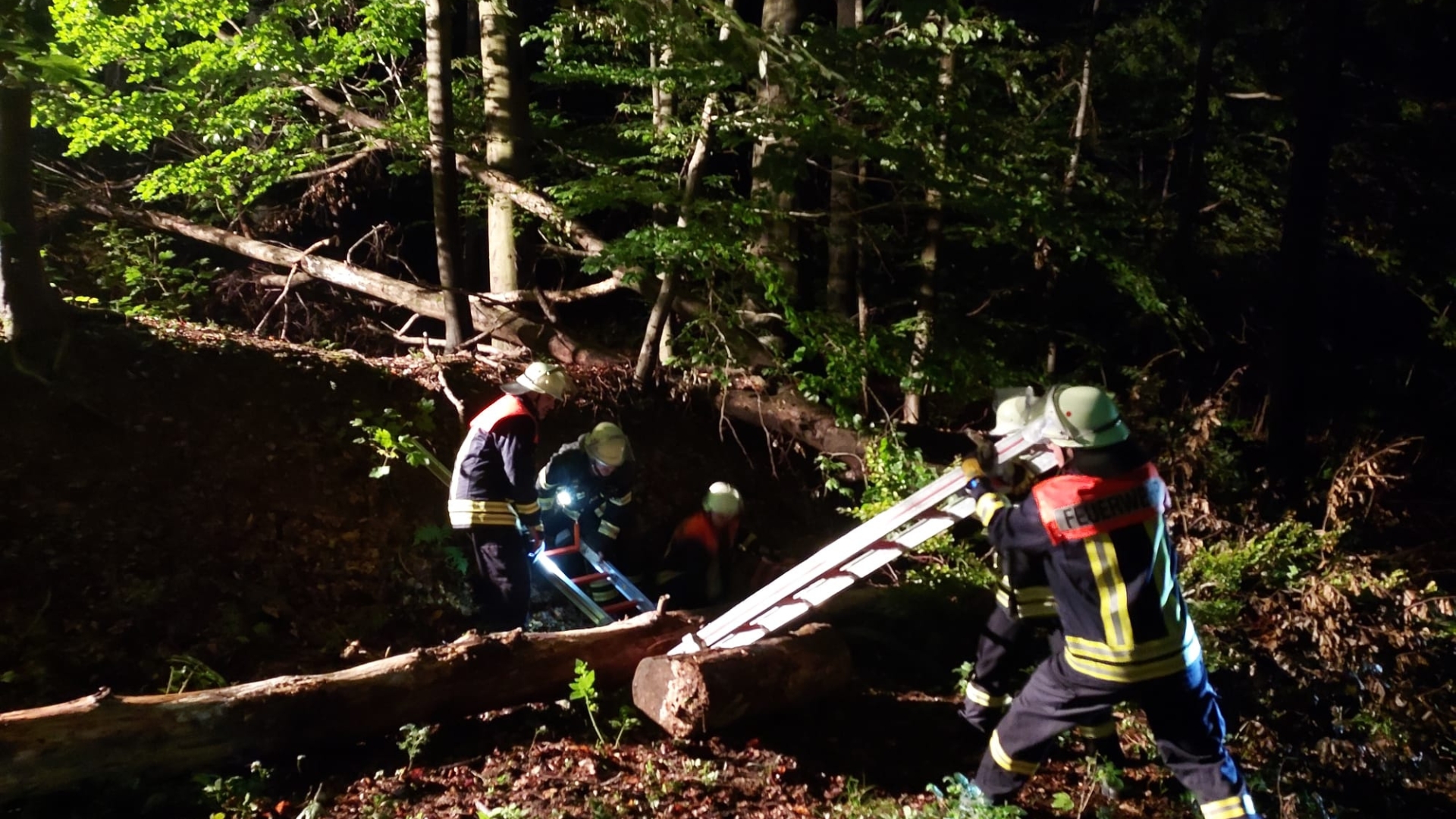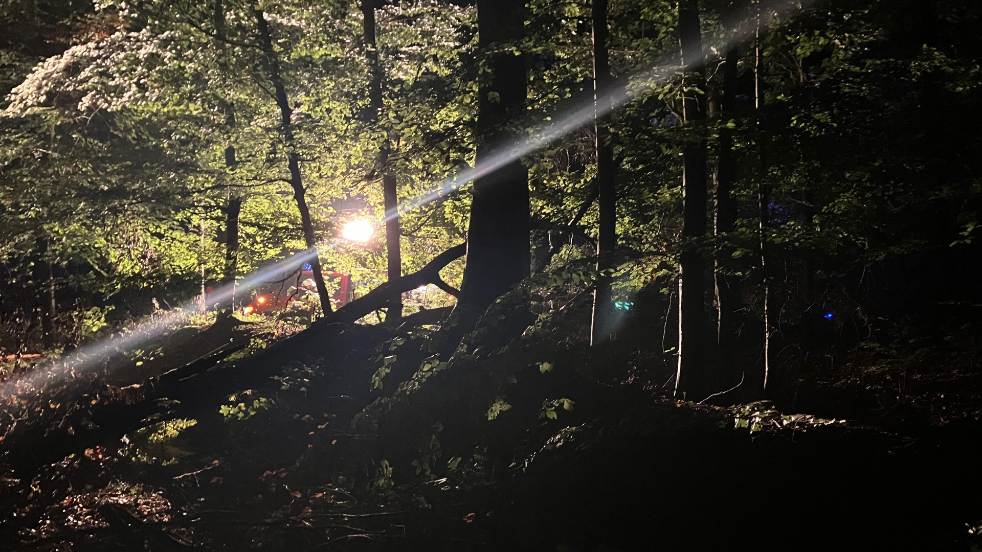 Vor Ort angekommen zeigte sich eine recht unübersichtliche Lage. Ein Forstunfall, eine eingeklemmte Person unter einem Baumstamm, ein vom Waldweg abgekommenes Fahrzeug mit samt verletztem Fahrer und noch eine weitere Person, die von diesem Fahrzeug angefahren wurde.